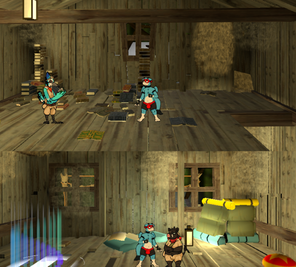 On the top floor, Griff stands on the far left, books left scattered on the floor or piled up in a chaotic fashion, and a lantern hanging above. There is a single window present, with wooden beams supporting the ceiling above. Dan is on the floor below, most likely resting while Griff finishes his research and both go out on the expedition they mention when talking to the player.