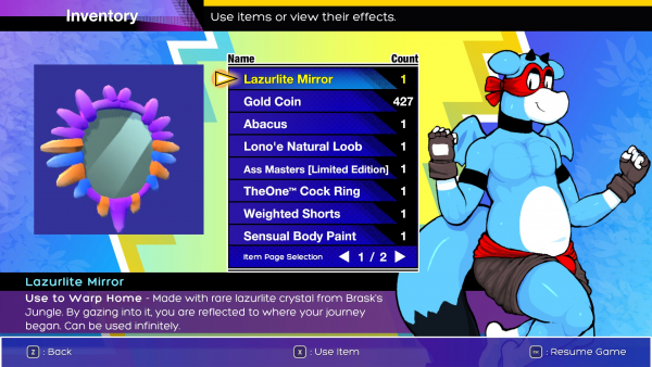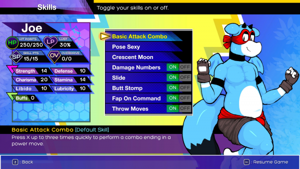 The player controls Joe, a character that is very adept at platforming, fighting and seducing opponents, and just how effective he is at these actions is determined by his stats. He starts with low numbers but can increase these by gathering items throughout his quest, each affecting a certain stat that helps the player in different ways.