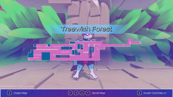 The inventory screen displays a list of the player’s currently held items as well as a visual preview and a description of the currently selected item. This list can be navigated with the movement inputs to change items and pages.