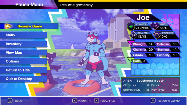 Joe’s status is displayed at all times in the top-left corner of the screen, the two bars represent his Health Points (HP) and Skill Points (SP) respectively, and above them, his Lust meter is displayed as a percentage. It is very important to keep an eye on these values at all times throughout your adventure. Next to these is an icon of Joe’s face, mostly there for aesthetics, but if the player is using Touch controls, such as those in the Android version, tapping on it will bring up the Pause Menu.