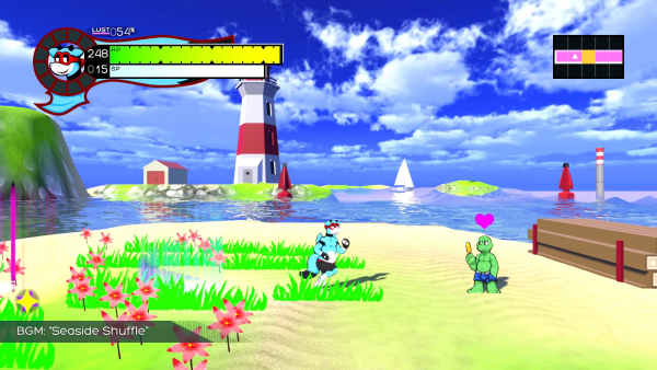 Lust is a value presented with a percentage representing how horny Joe is, this goes up as the enemies tease and grope him. Once the meter reaches 100%, Joe will be totally unable to move and he’ll succumb to his needs, he’ll drop his pants and will need to relieve himself then and there, the player has no control over him in this state other than using the Rhythm meter to speed the process a little.