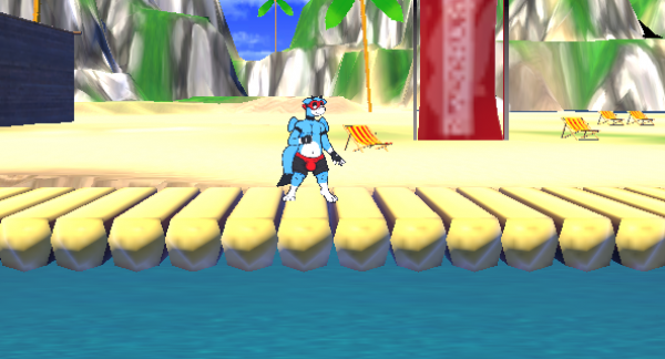 The Sheo Islands Beach is the starting area of the game that the player will load into in new save files. The map is mostly a beach location with a bridge over the water at the beginning for connecting the player to the rest of the zone. In the background is a collection of cliffs, some with waterfalls, and various deck chairs, flags, billboards, and hot dog stands filling the in-between while palm trees cover most of the land. There's also the occasional volleyball net and blue starfish that can be seen on the ground.