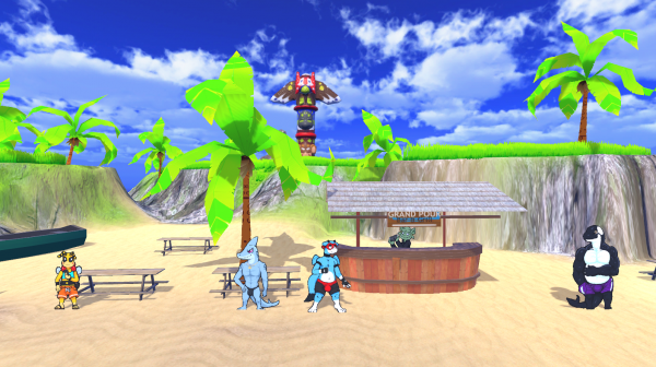 Smol beach is a small beach that the player can visit and hang out with the many NPCs found at the location. Initially dark as the player leaves the Forbidden Bayou, with a skull decoration seen in the swamp hanging over head, things quickly brighten up again as they progress. The background here is composed of rocky hills, palm trees and the odd totem or two, while the foreground offers a dining area for the Grand Pour Bar & Grill, with four picnic benches surrounding it. A lone rowing boat is also left on the sand.